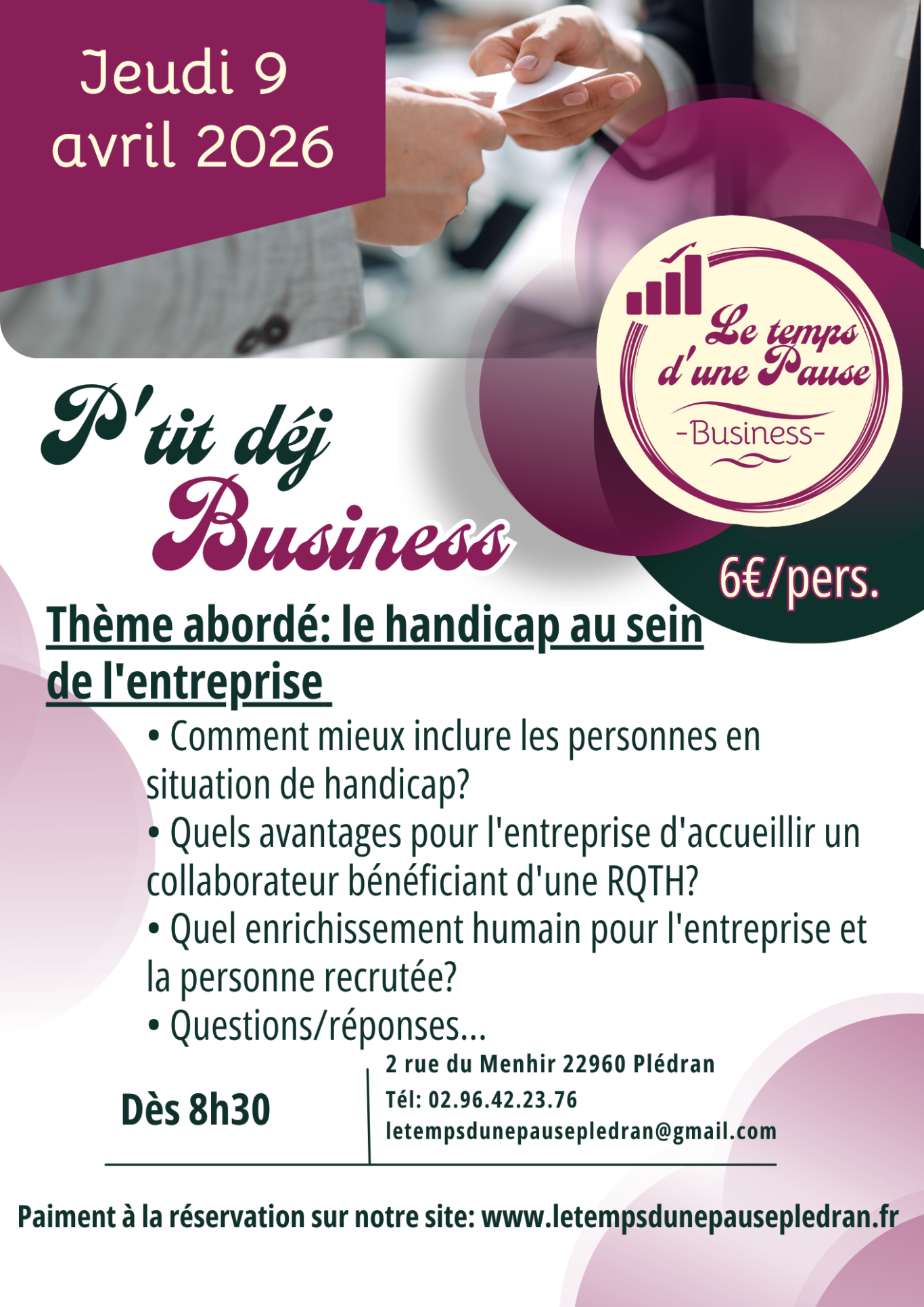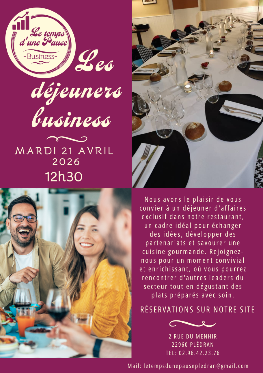 Chaque mois nous vous donnons rendez-vous pour un petit déjeuner et un déjeuner qui vous donnera l'occasion d'allier l'utile à l'agréable...